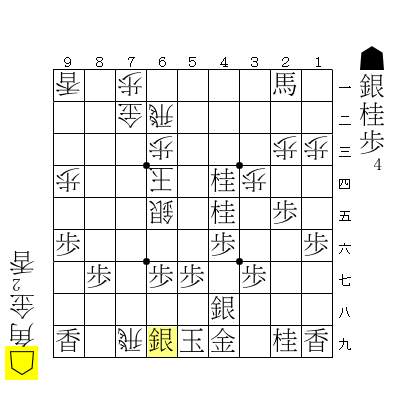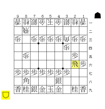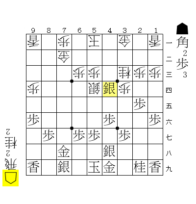 後手私。先手が浮き飛車できました。▲36飛~▲34飛と角頭の歩取られるの嫌なんですよね。先手が歩をとるために3手かけてるので、後手が悪いはずはないんですけど、気持ちはいやなんですよね。ここでソフト推奨は△44角と飛車にあてる手。飛車が縦に逃げれば、△86歩▲同歩△同飛▲96歩87飛成で最低龍がつくれます。横に逃げた場合は先手の飛車の位置が悪そうなので何とかなりますかね?次やられたら、とりあえず△44角指してみよう。
