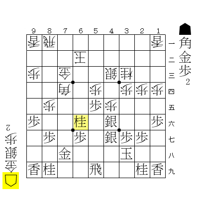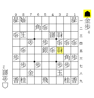 私は後手少し悪いと感じていたのですが、ソフト評価値は後手ややよし。そういうもんですか。銀桂交換の後手駒得ですが、後手玉が露出していて指しにくいと感じていました。後手玉が広く手厚く、先手の78金が遊びそうな分よいということでしょうか。難しい。