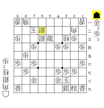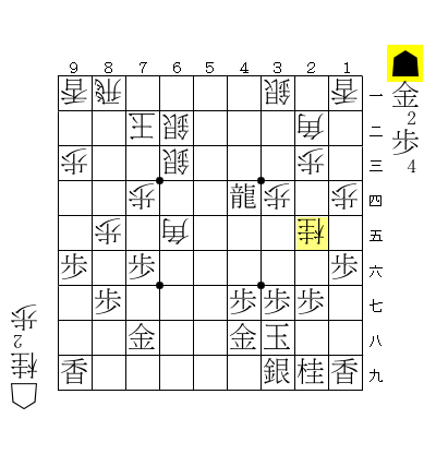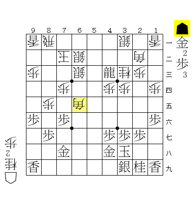 図から▲64歩が悪手。33にいた桂が25に跳ねたことで龍が角に当たっていることをウッカリしたのだと思います。本局で22の角はずうっと桂馬の陰に隠れていましたので先手もウッカリしやすかったのだと思います。角が最後に役に立ってよかったよかった。