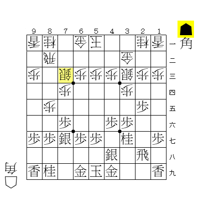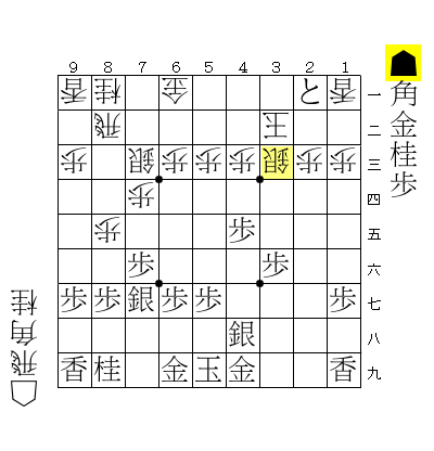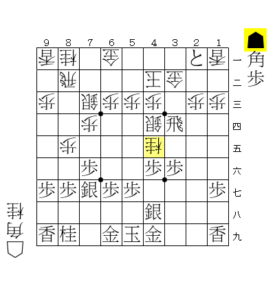 先手私。戦型は角換わり。53の地点に後手の駒が効いていないときは、だいたいあれが成立します。もうおわかりですね。そう、角換わり▲45桂速攻です。