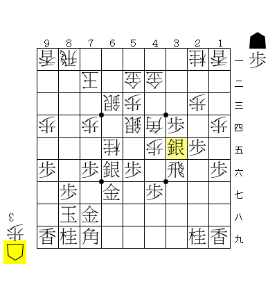 図でソフト推奨は先受けの△44角。▲34歩には△同銀ととれば、35の地点を角銀の2枚で守ることができます。対して▲38飛なら△26角▲34飛と銀交換をして後手が1000点ぐらいいみたいです。大駒の働きが後手の方がよいということでしょうか。